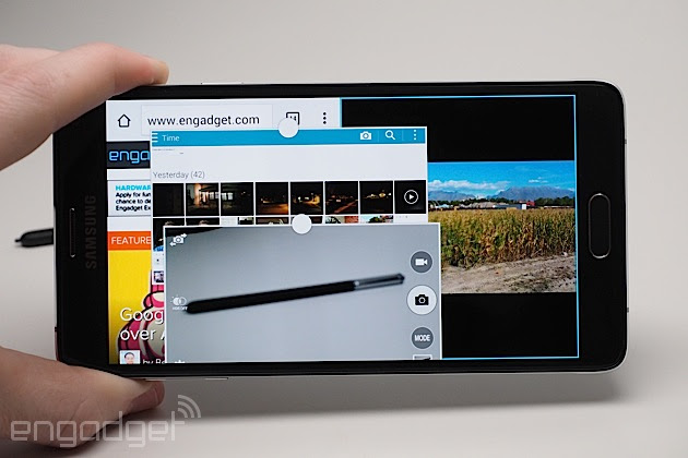 Multi Window, one of my favorite Samsung features, is slightly improved. The camera viewfinder can now be opened into this mode, which is helpful if you're prone to falling into manholes or walking into street signs while texting. Also, when you go into the recent apps menu, certain apps come with a new dual-pane icon that opens the program directly into Multi Window mode. You can also transfer files from one window to another, and tapping on links in apps (Twitter, Facebook, Maps and so on) will open that link below in a second window, rather than closing one app and opening another.
